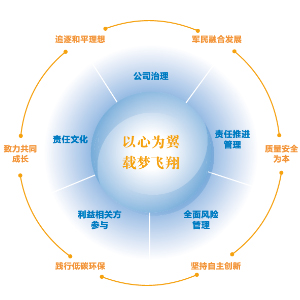 本模型寓意履行社会责任将为航空工业的可持续发展提供不竭的强劲动力,直观的展现了公司履行社会责任的内容、特点及保障机制。