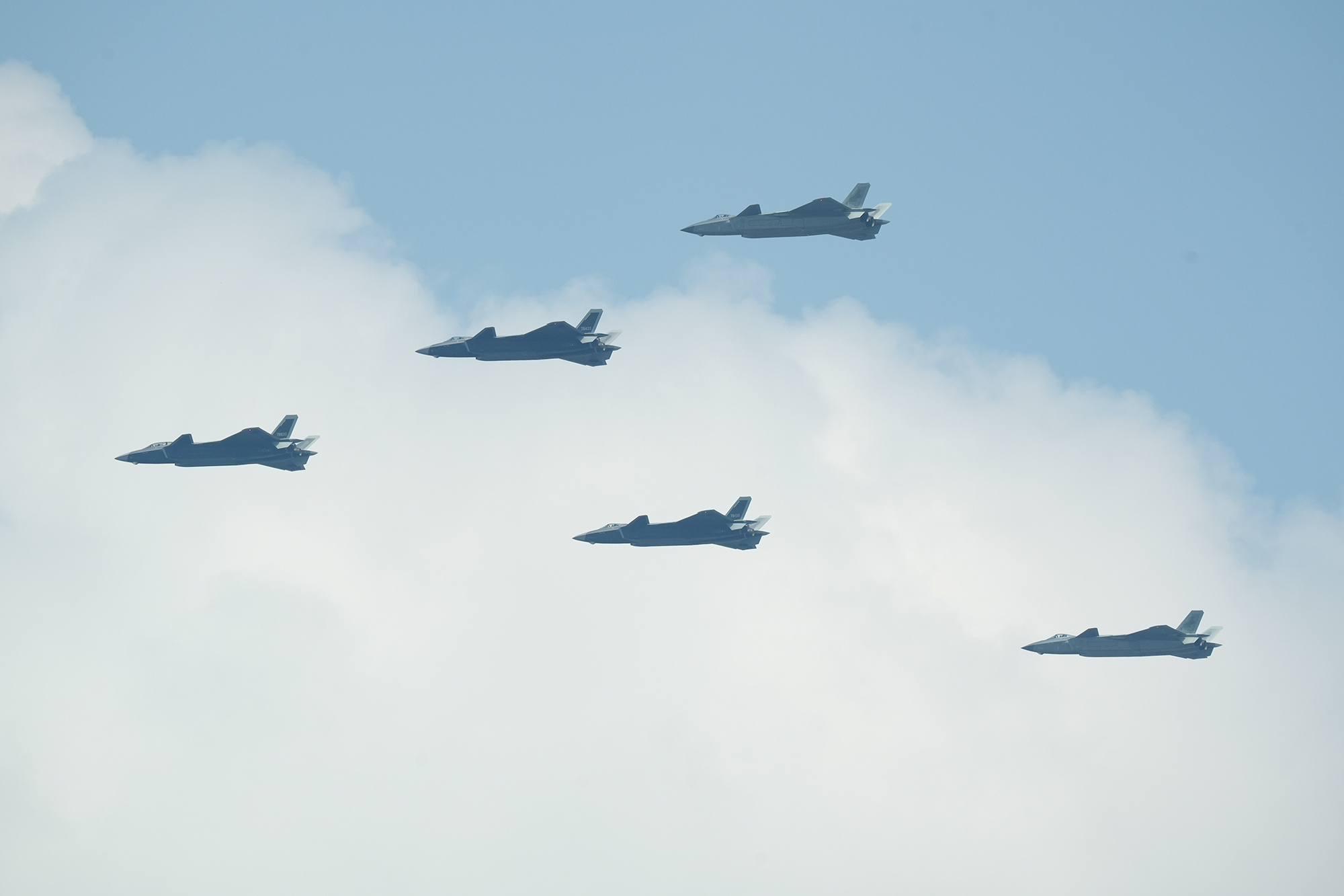 歼击机梯队接受检阅。歼16D、歼20、歼35A、歼20S、歼20A,编成两个楔队震撼亮相。摄影:郑宇航